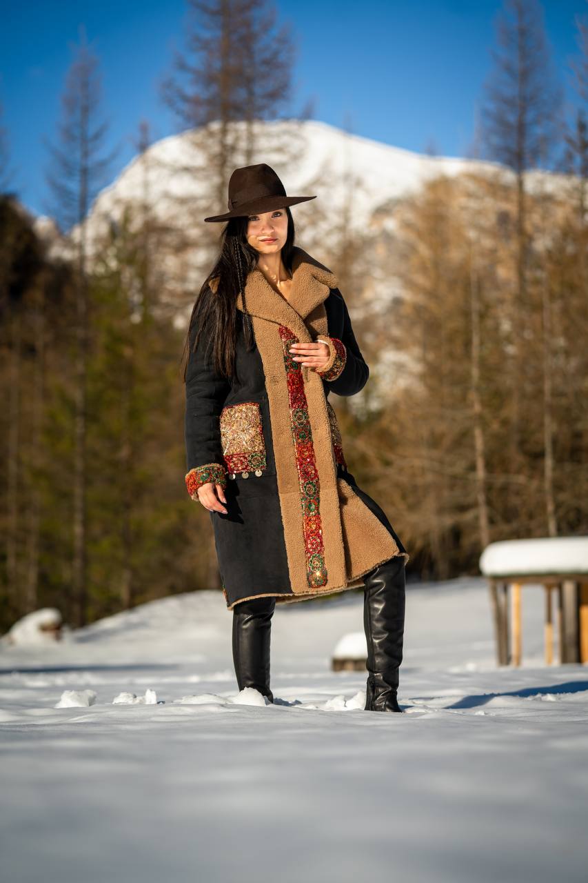 Il cappotto in montone vero, ricamato tutto a mano con i tessuti indiani ed afgani, il cappotto ha gli applicazioni tipo i ciondoli con le monete antiche persiane.