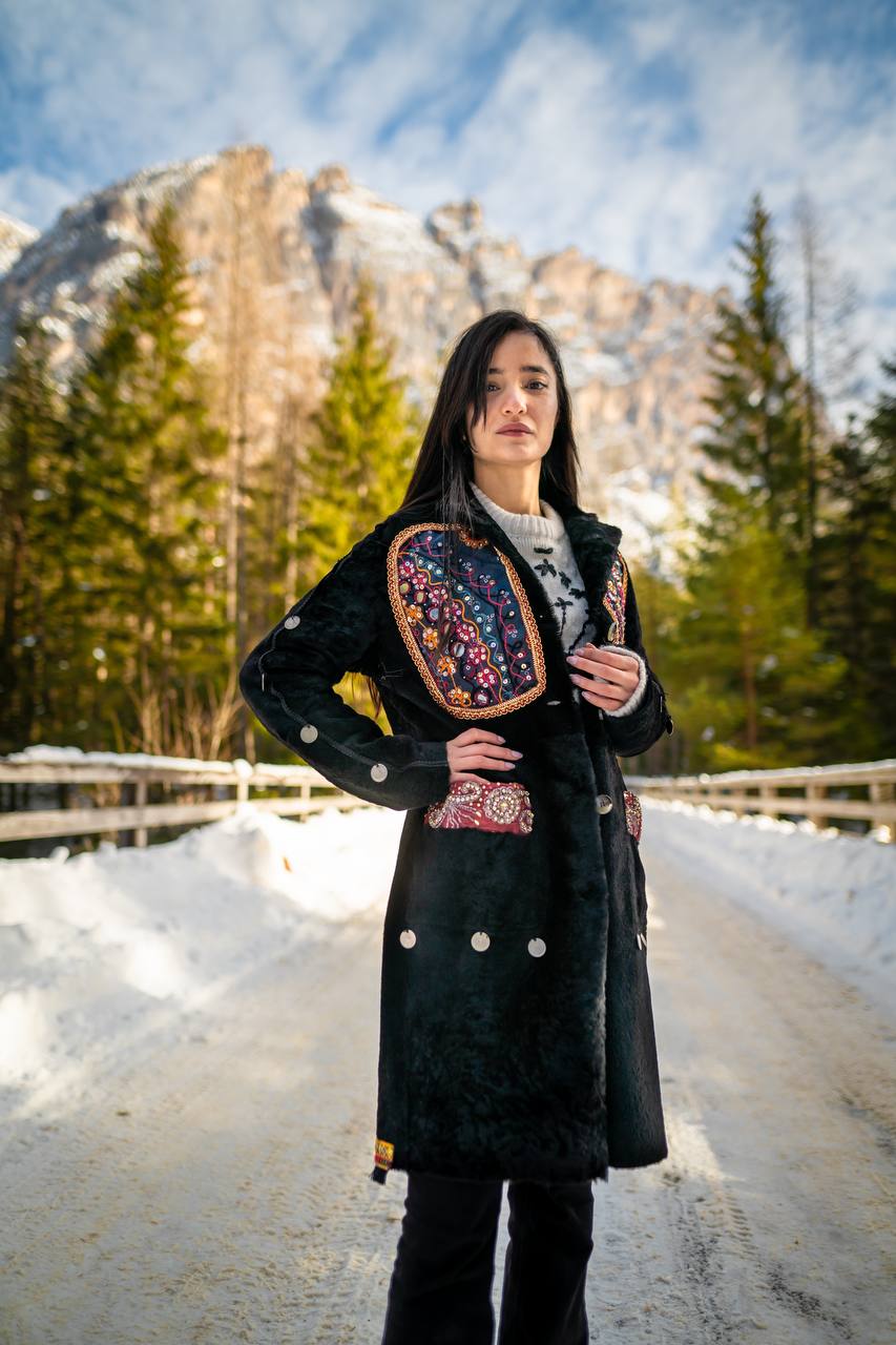 Il cappotto in montone vero, ricamato tutto a mano con i tessuti indiani ed afgani, il cappotto ha gli applicazioni tipo i ciondoli con le monete antiche persiane.