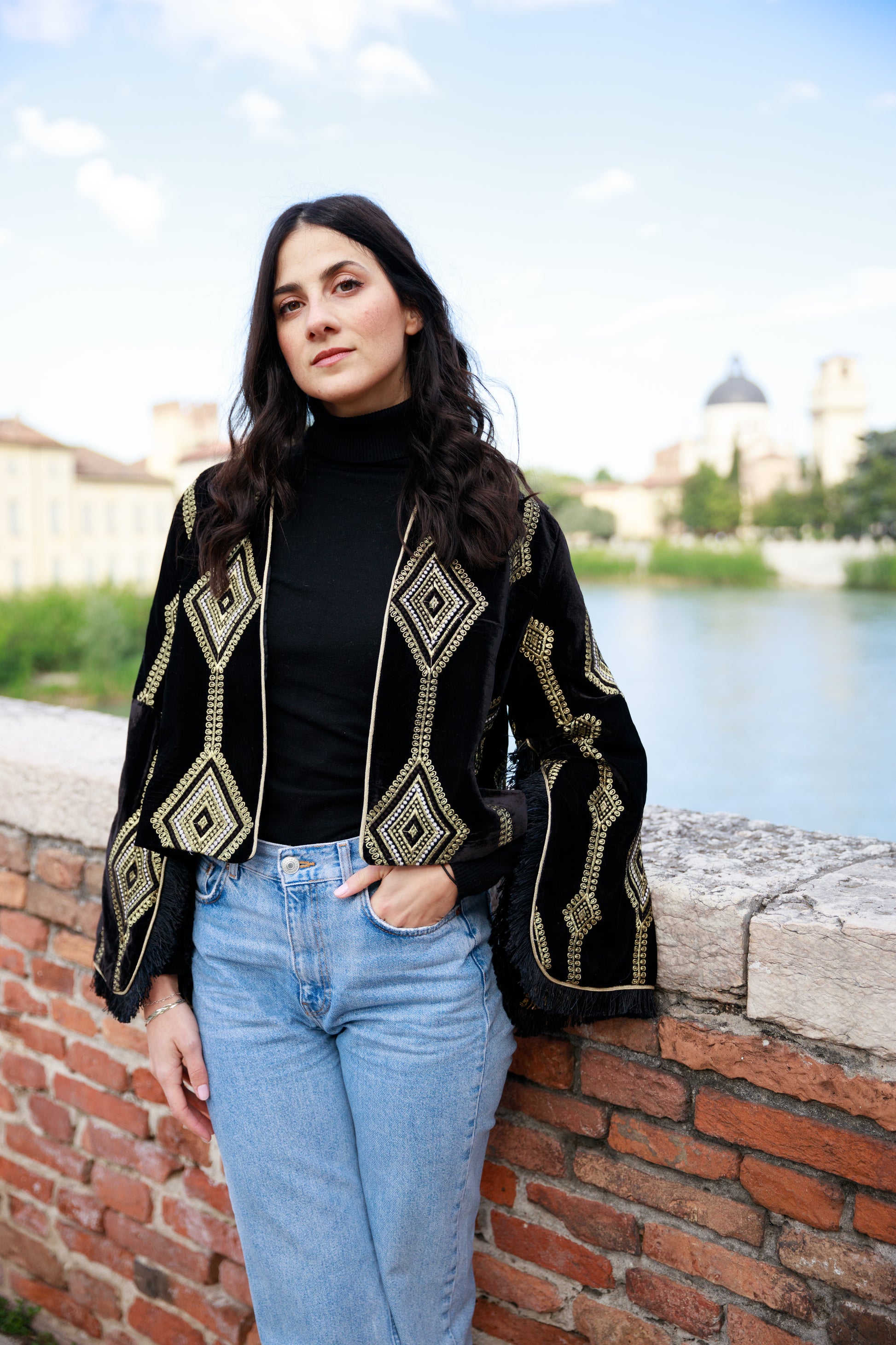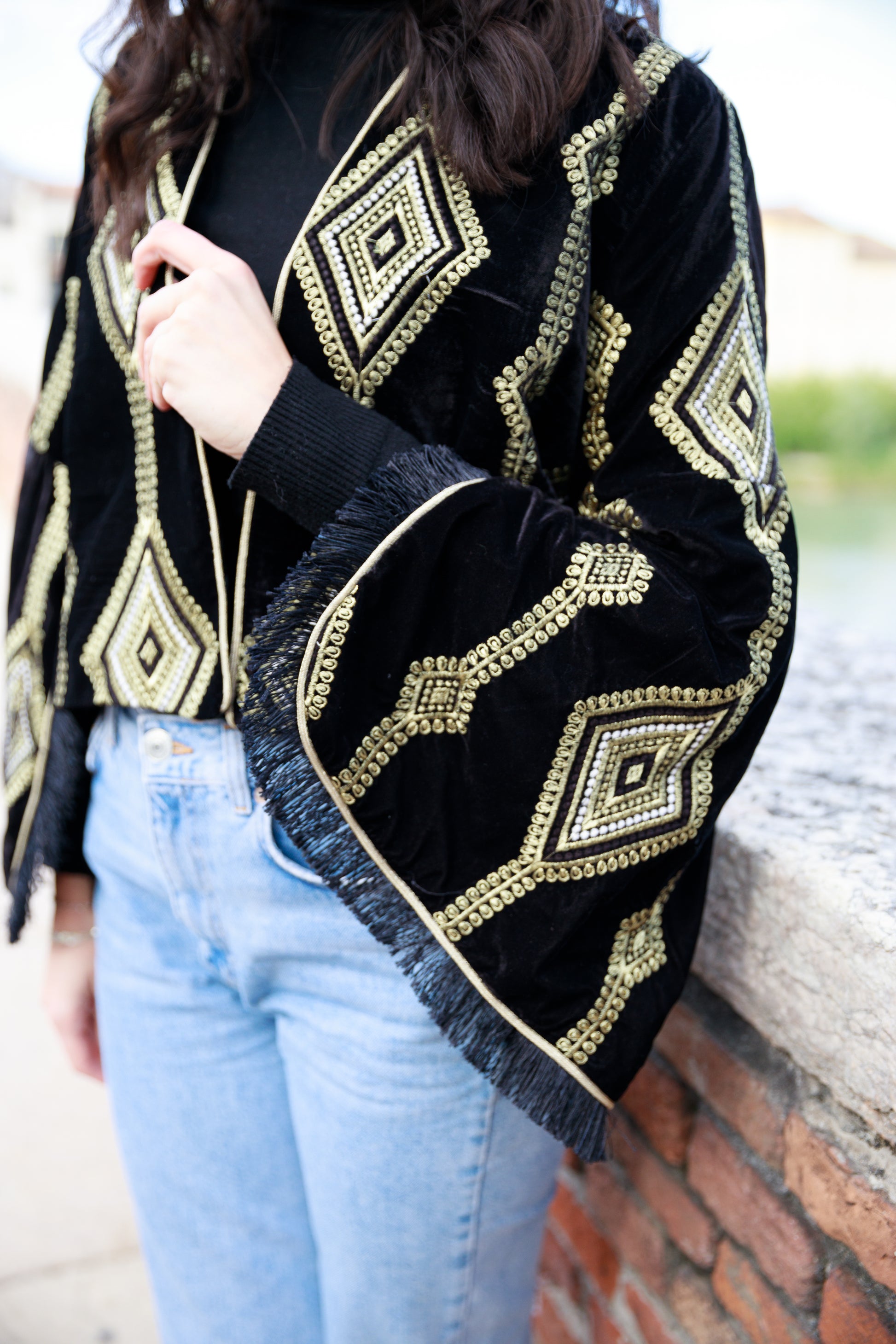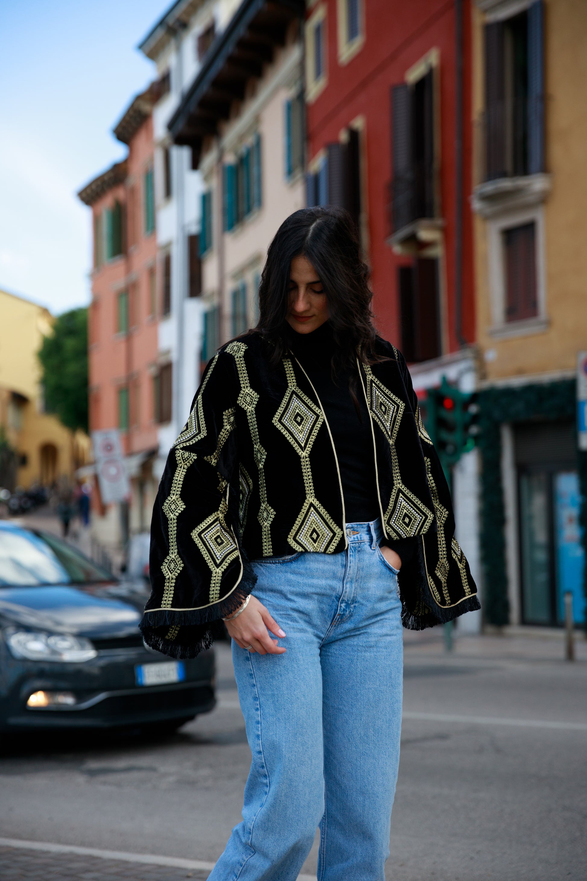Giacca aperta in velluto, foderata, ricamata in oro con le maniche con lo spacco laterale e con la frangia al fondo.