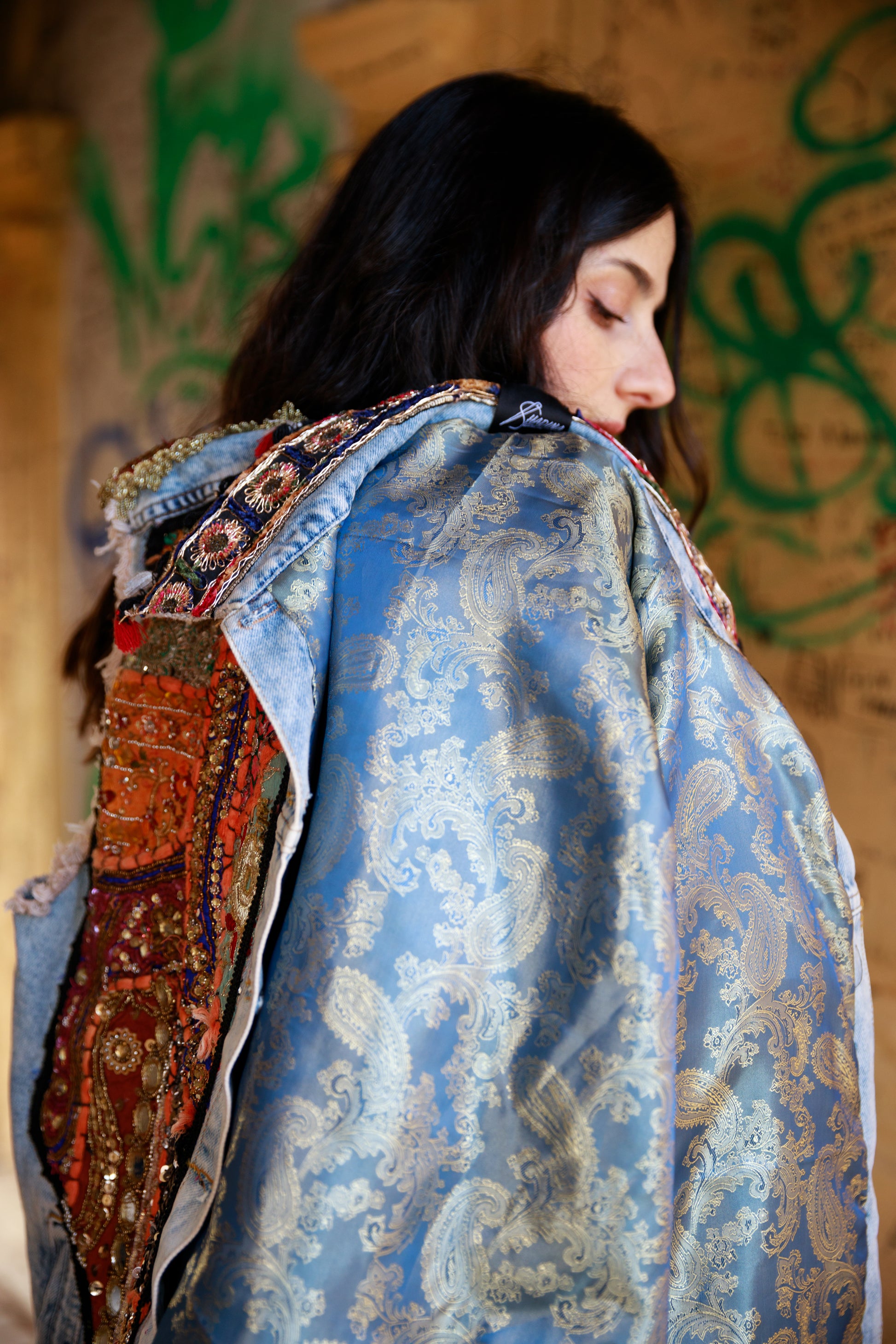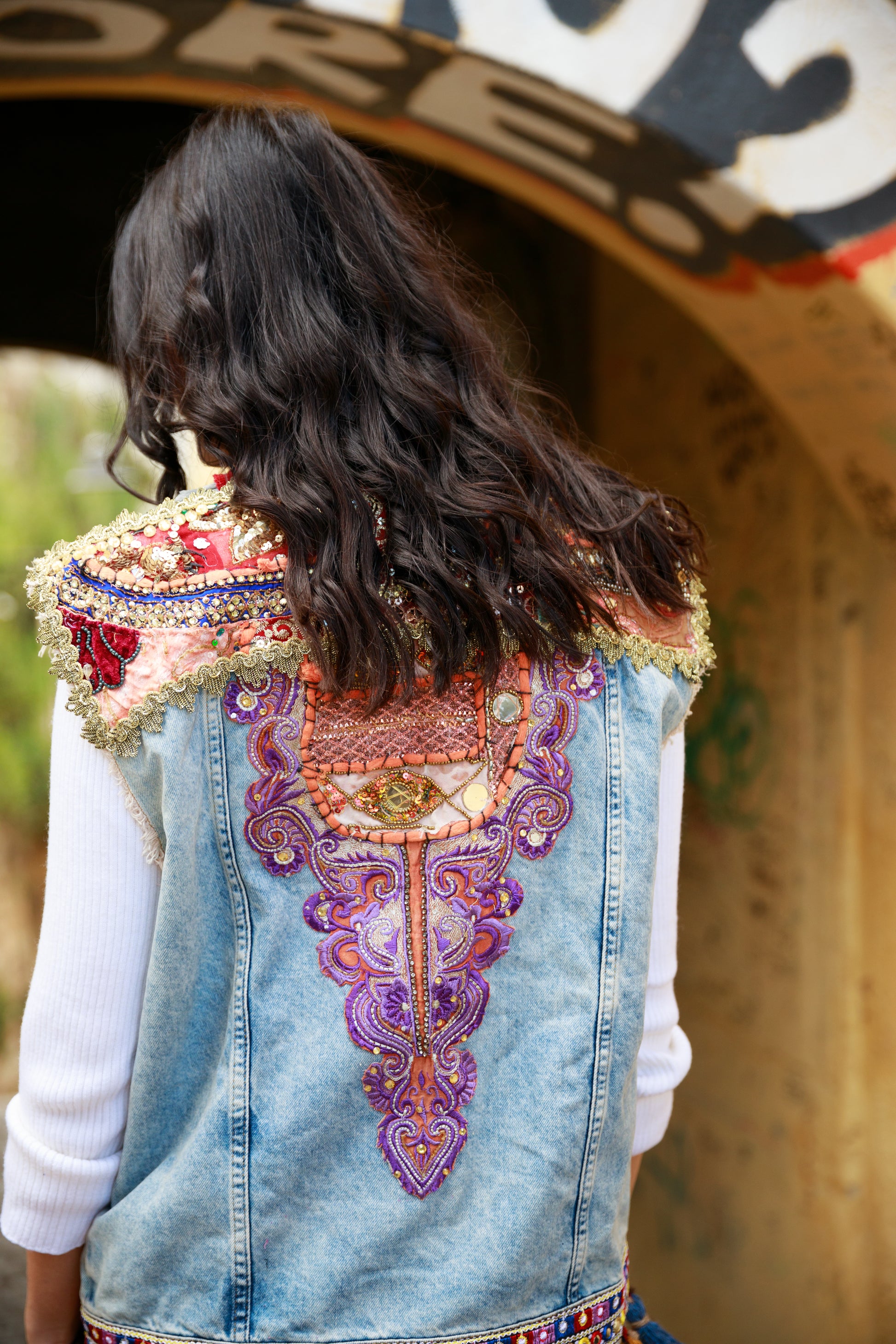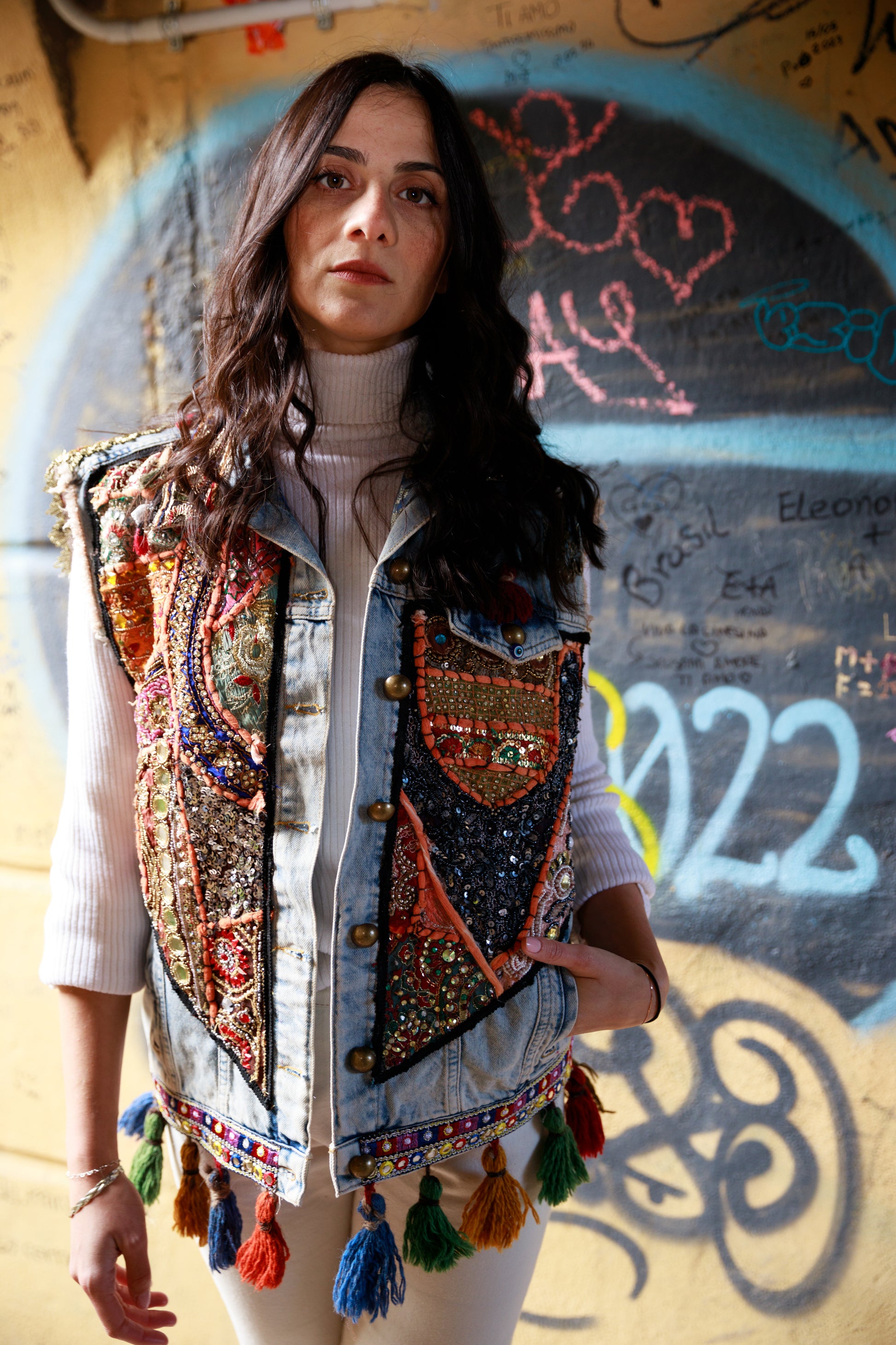 Gilet in denim realizzato con patchwork di antichi tessuti indiani ricamati a mano; pezzo unico, con applicazioni di paillettes; foderato, chiusura con bottoni.