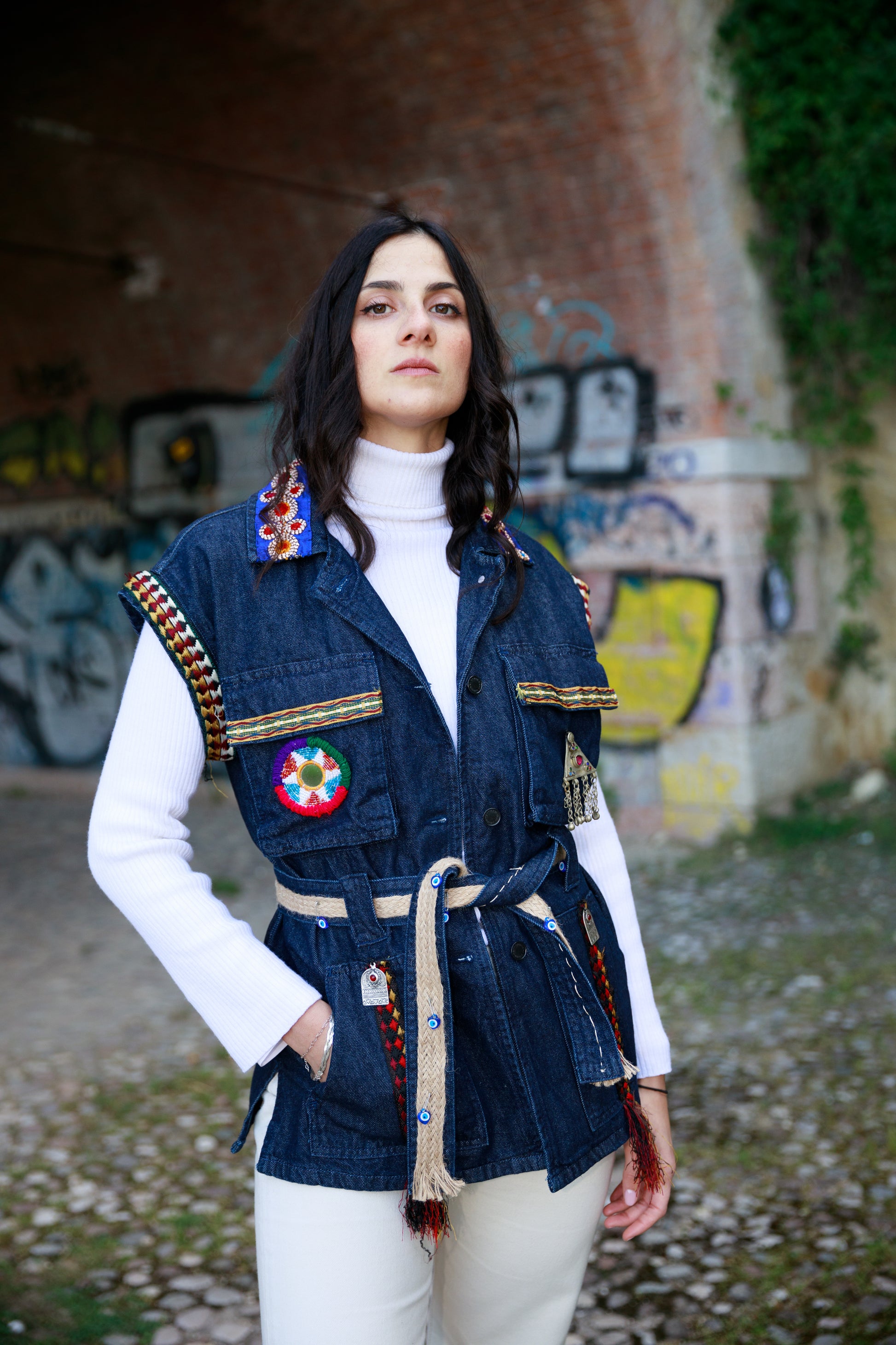 Trench in denim, ricamato a mano; pezzo unico, con applicazioni di paillettes, ciondoli; sfoderato, con la cintura staccabile, chiusura con bottoni.